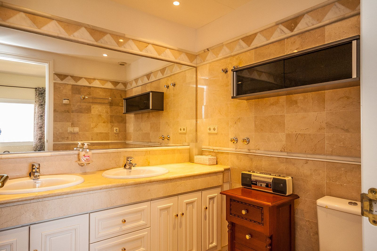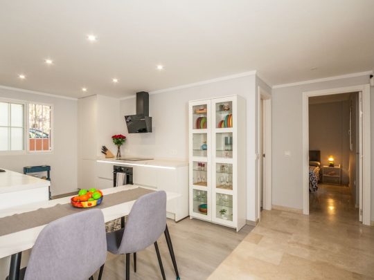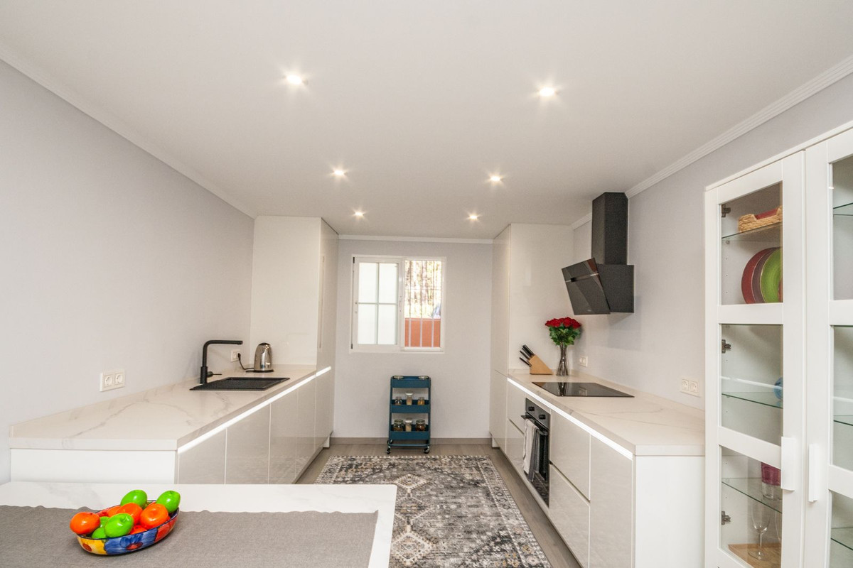 This beautifully refurbished ground floor apartment is located in the sought-after area of Elviria, just a 2 minute walk to the beach and right in the heart of the village, next to local shops, restaurants and local amenities. The property offers 124 m² of stylish living space plus a 27 m² private terrace, perfect for enjoying the Costa del Sol sunshine and relaxing with views of the lush gardens and communal pool. Inside, you'll find a bright and modern layout featuring a brand new fully fitted kitchen, spacious living and dining area, and two generous bedrooms, both with fitted wardrobes. The master bedroom includes an en-suite bathroom. Situated in an exclusive gated complex, residents benefit from beautifully maintained communal gardens, a large swimming pool, and underground private parking.