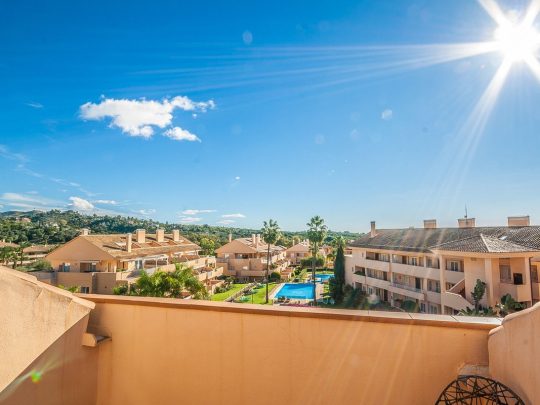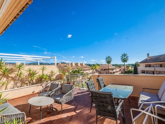 This exquisite duplex penthouse offers a perfect blend of luxury and convenience, featuring a well-appointed lower floor that includes a modern kitchen with a utility area, a comfortable bedroom with a stylish bathroom and a spacious living/dining area and the expansive uncovered terrace provides stunning views of the communal gardens and swimming pool. The upper level boasts an additional bedroom with an en-suite bathroom and a small terrace, enhancing the living experience. With new furniture and kitchen appliances, this property is move-in ready. Located in a prime area within walking distance to shops, bars, restaurants, and the beach, it is situated in a gated community that offers 24-hour security. Additionally there is an underground private parking space and a storage room for added convenience.